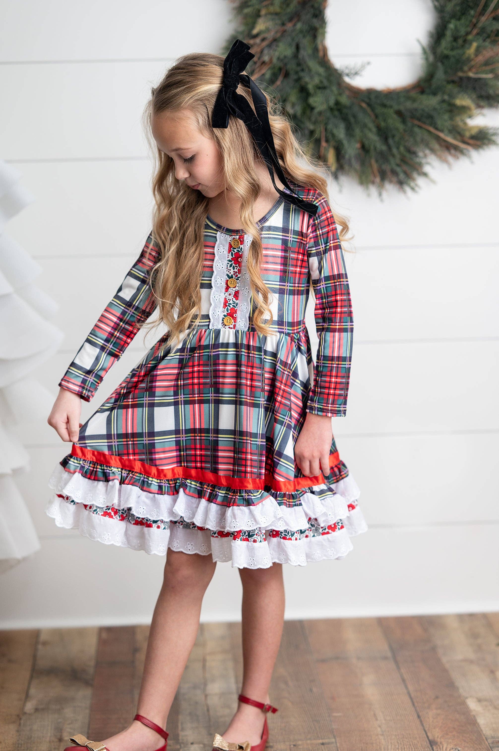 Adorable Sweetness - Holiday Christmas Plaid Lace Ruffle Bow Back Dress